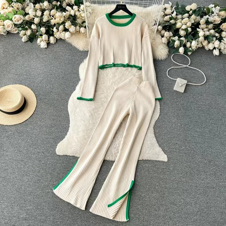 Trendy two-piece ribbed knit set featuring a cropped sweater and high-waisted split-hem pants with contrast edges πΏ β cozy, chic, and perfect for casual days or travel style. π«