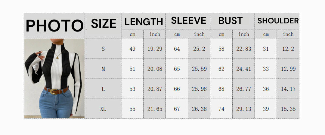 Chic and form-fitting, this ribbed knit turtleneck features bold vertical color blocking for a sleek, elongating effect. With its soft stretch fabric and flattering silhouette, it’s perfect for dressing up or down — effortlessly stylish with jeans, skirts, or tailored pants ✨.