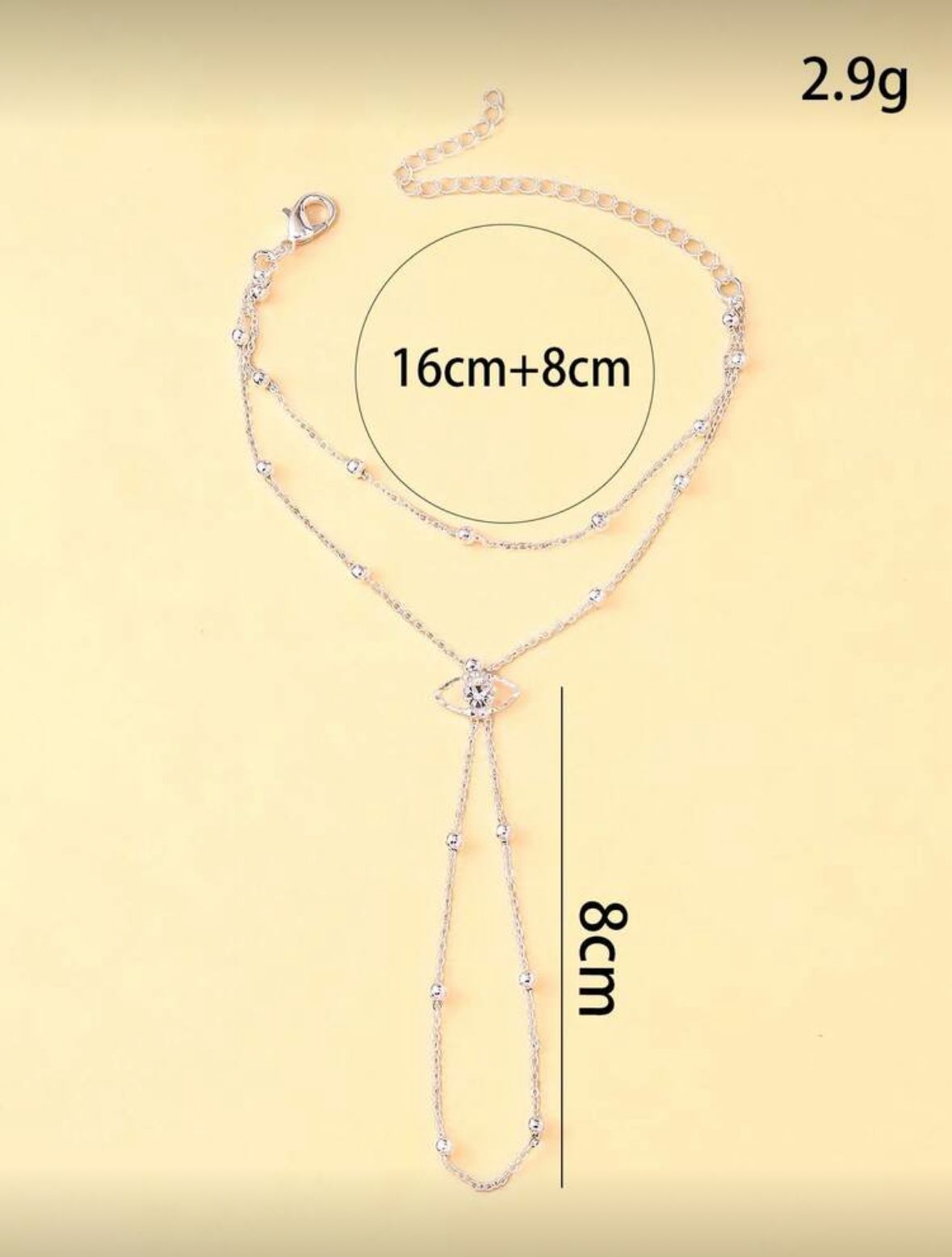A refined gold hand chain featuring the symbolic evil eye centerpiece adorned with a sparkling crystal.✨ Its minimalist chain connects the ring and bracelet with delicate golden beads for subtle glamour.🌸This elegant design blends protection and style, perfect for both daily wear and special occasions.💛