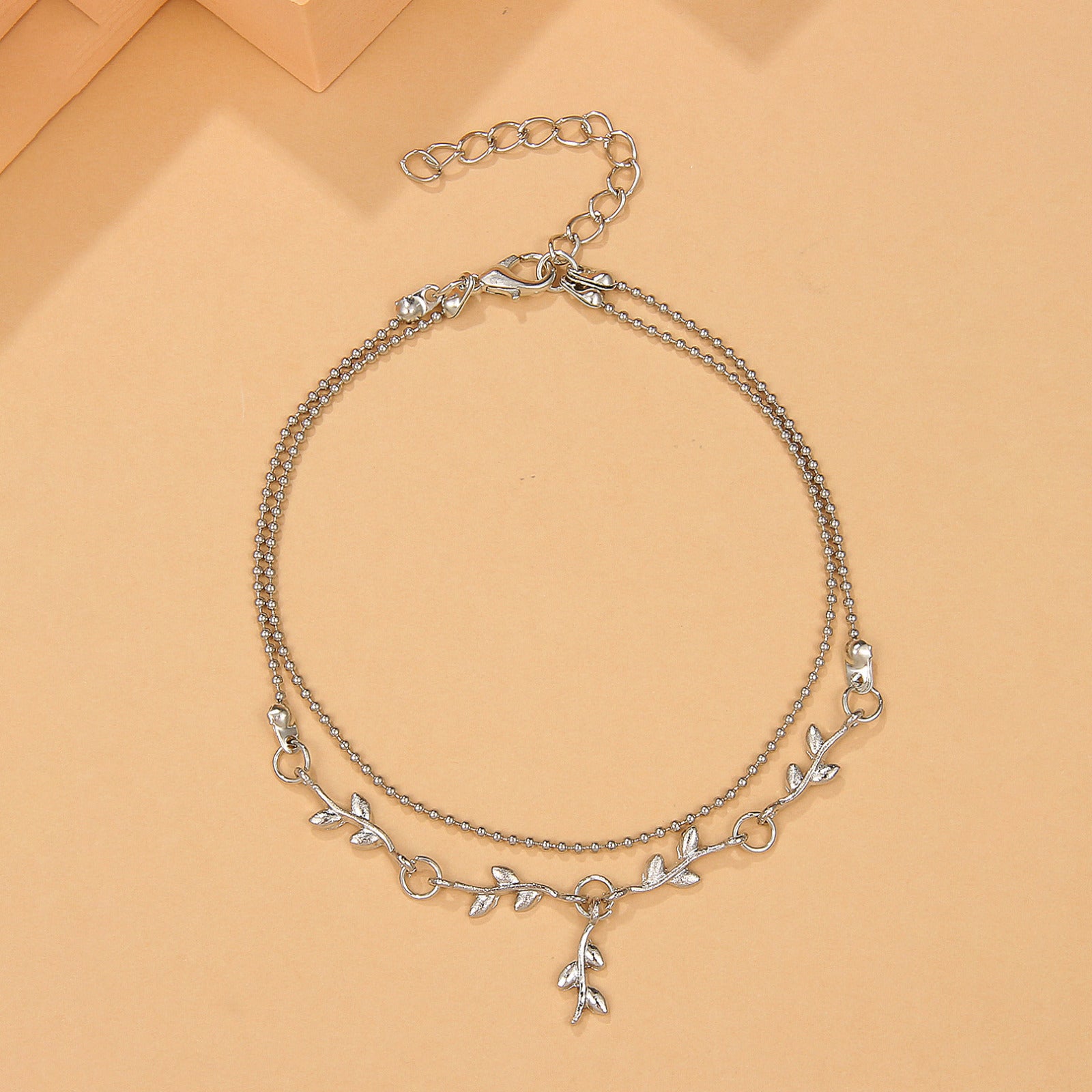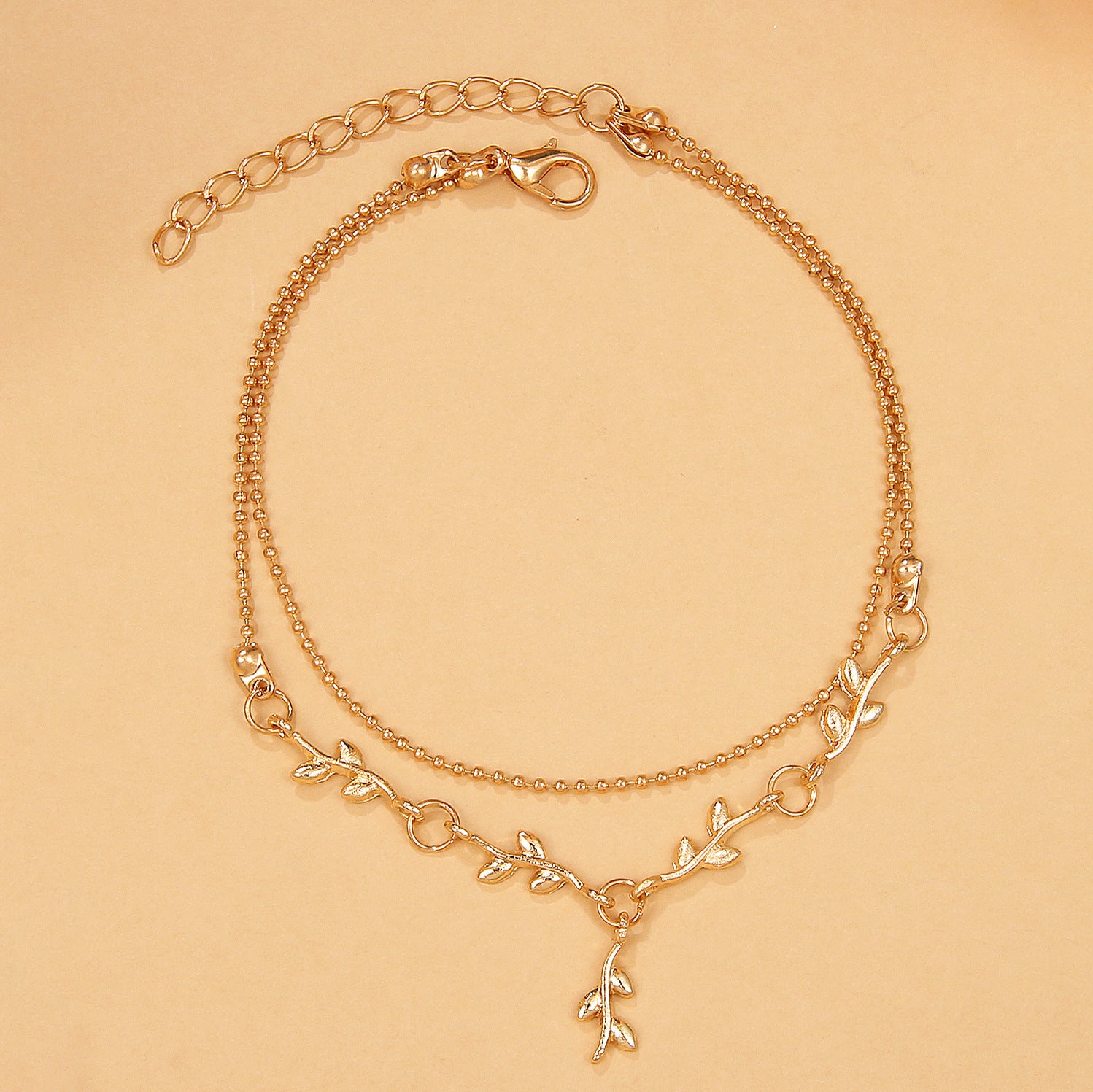 A graceful double-layer anklet combining minimalist charm with nature-inspired elegance.✨ The design features a fine chain paired with delicate gold leaves that drape beautifully around the ankle.💛 Perfect for adding a touch of boho sophistication to any summer outfit — ideal for beach days, barefoot walks, or casual chic looks.🌸