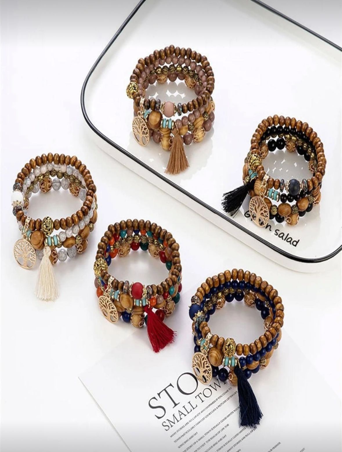 These boho-inspired bracelets feature a mix of natural wood, marble, and gold-tone beads. โจ Each stack is adorned with a tassel and a symbolic tree of life charm.๐ชถ Designed to embody balance, grounding, and positive energy. Perfect for layering and adding earthy elegance to any outfit.๐ซ