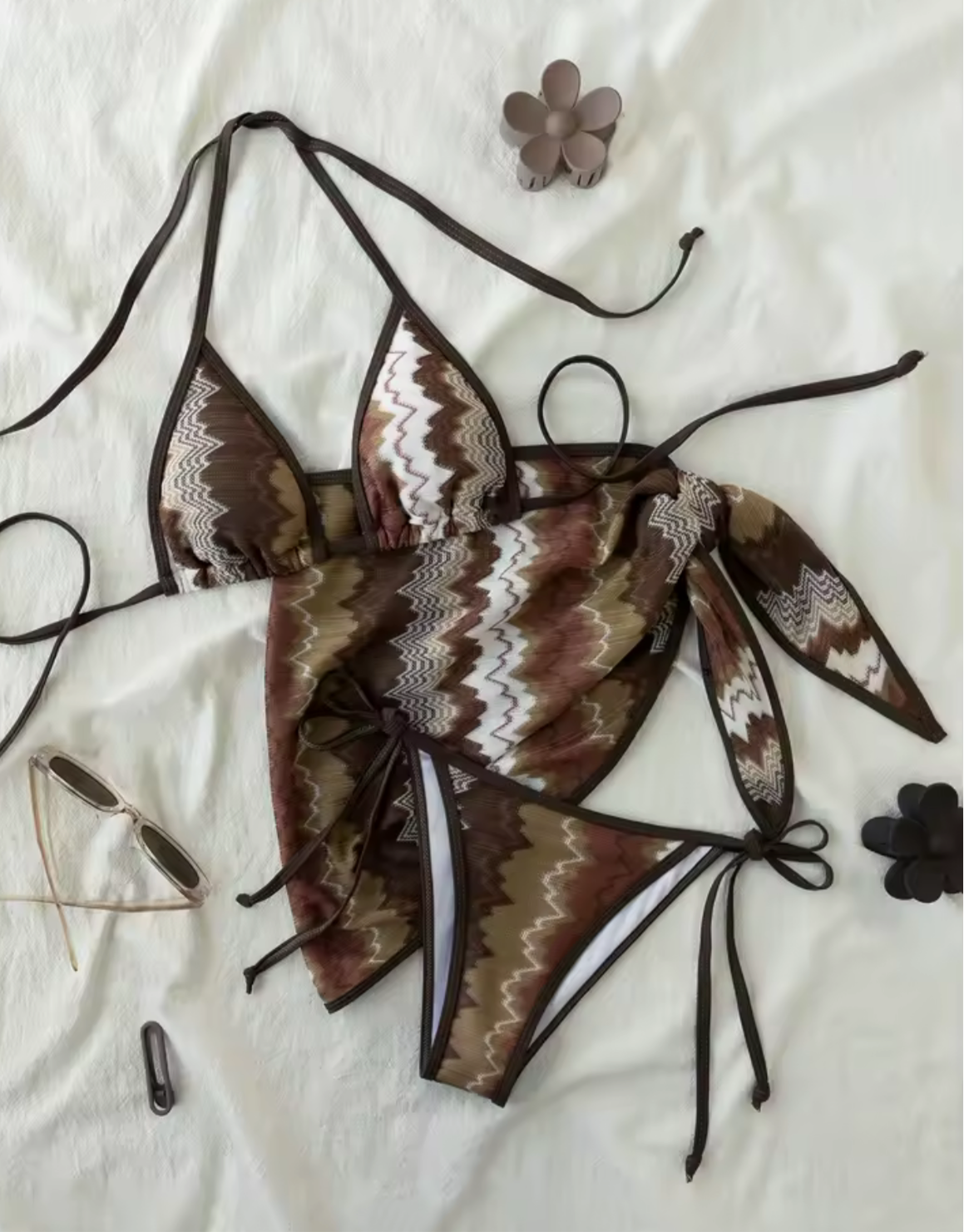 Capture the golden magic of the desert in this stunning three-piece bikini set. With a warm, earthy wave print inspired by sun-kissed dunes and glowing twilight skies, this set brings effortless boho elegance to your beach look. ๐พ