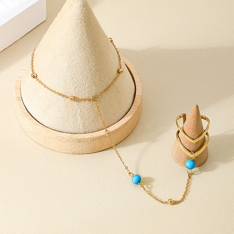 A delicate gold hand chain featuring a turquoise bead centerpiece for a touch of bohemian charm.π« Connecting seamlessly from bracelet to ring, this piece adds elegance and modern flair to any outfit.πΏPerfect for layering or wearing solo for a minimalist statement.π
