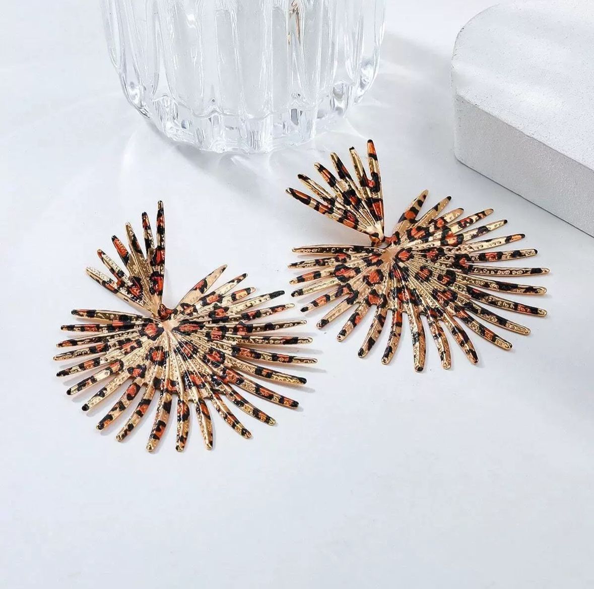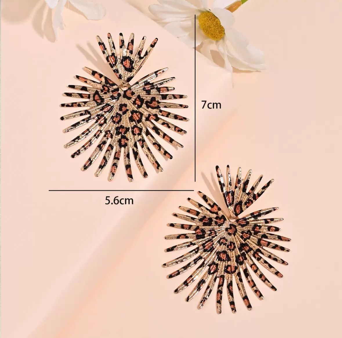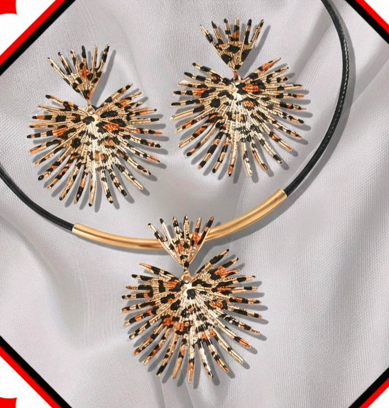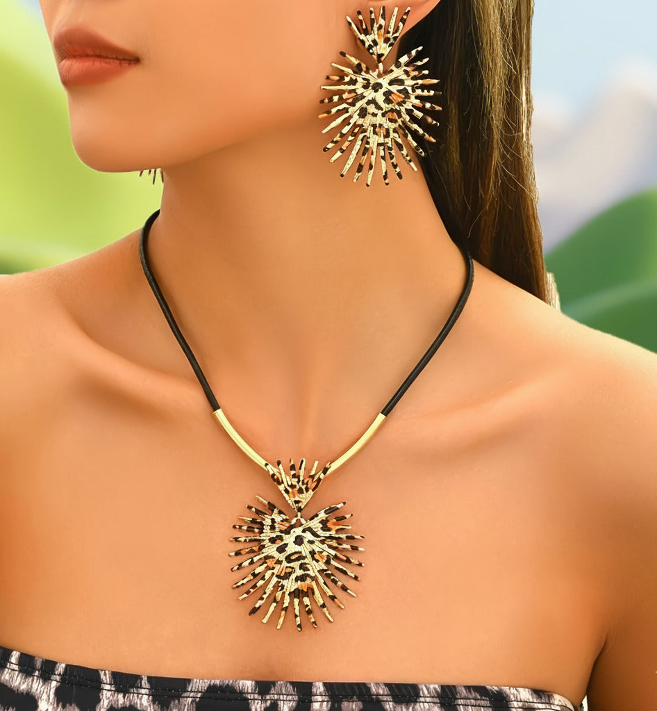 This striking jewelry set features bold sunburst designs with a chic leopard print.🔥 The pendant hangs on a sleek cord for a modern, confident look.💛 Matching statement earrings complete the fierce ensemble. Perfect for adding an exotic touch to any outfit.💃
